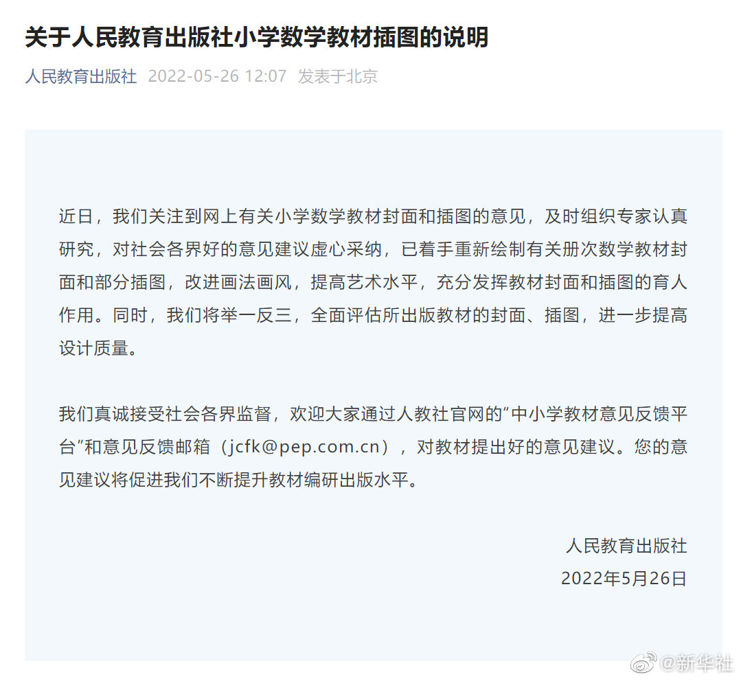 人民教育出版社微博發(fā)布《關(guān)于人民教育出版社小學(xué)數(shù)學(xué)教材插圖的說明》:近日,我們關(guān)注到網(wǎng)上有關(guān)小學(xué)數(shù)學(xué)教材封面和插圖的意見,及時(shí)組織專家認(rèn)真研究,對社會各界好的意見建議虛心采納,已著手重新繪制有關(guān)冊次數(shù)學(xué)教材封面和部分插圖,改進(jìn)畫法畫風(fēng),提高藝術(shù)水平,充分發(fā)揮教材封面和插圖的育人作用。同時(shí),我們將舉一反三,全面評估所出版教材的封面、插圖,進(jìn)一步提高設(shè)計(jì)質(zhì)量。 我們真誠接受社會各界監(jiān)督,歡迎大家通過人教社官網(wǎng)的“中小學(xué)教材意見反饋平臺”和意見反饋郵箱(jcfk@pep.com.cn),對教材提出好的意見建議。您的意見建議將促進(jìn)我們不斷提升教材編研出版水平。