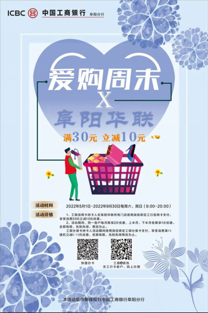 ![]() 愛購百貨 2022年5月1日至2022年9月30日上午9點:00-晚20:00,微信綁定工行信用卡或e錢包在阜陽商廈、國貿(mào)商城消費,滿200元隨機立減30元。 ![]() ![]() 愛購華聯(lián) 2022年5月1日至2022年9月30日上午9點:00-晚20:00,微信綁定工行信用卡或e錢包在阜陽華聯(lián)指定門店消費,滿30元隨機立減10元。