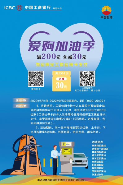 ![]() 愛購加油 2022年5月1日至2022年9月30日上午9點:00-晚20:00,微信綁定工行信用卡或e錢包在中國石化、中國石油指定門店消費,滿200元隨機立減30元。 ![]()