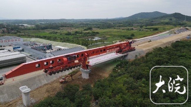 大皖新聞訊 記者從中國鐵路上海局集團有限公司獲悉,8月27日13時30分,在合肥市肥東縣包公鎮(zhèn)施工現(xiàn)場,隨著“昆侖號—Ⅱ型”運架一體機將長40.6米、寬12.6米、高3.25米,重930噸的箱梁穩(wěn)穩(wěn)地架設(shè)在南鷹莊特大橋橋臺——18號橋墩上,標(biāo)志著上海至南京至合肥高鐵首榀箱梁成功架設(shè),項目建設(shè)施工進入全線架梁階段。