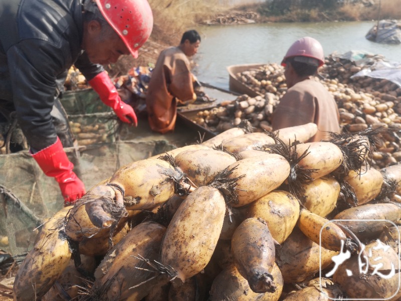 開欄語:又是一年新春將至。放眼江淮大地,多少新氣象、多少新變化,就發(fā)生在我們身邊。 到基層去,將鏡頭、筆觸直接延伸到社會生活的最前沿,用腳步丈量民情,用心靈感受民生。新安晚報、安徽網(wǎng)、大皖新聞從即日起推出《新春走基層》欄目,將推出最鮮活、最生動、最感人的新聞報道,展現(xiàn)真實、全面、立體的安徽。 大皖新聞訊 新春將至,年味兒漸濃。安慶市宜秀區(qū)白澤湖鄉(xiāng)因大面積發(fā)展蔬菜產(chǎn)業(yè),被譽為安慶城區(qū)的“菜園子”。1月23日,室外天寒地凍,新安晚報、安徽網(wǎng)、大皖新聞記者走進白澤湖鄉(xiāng),發(fā)現(xiàn)堅守在蔬菜基地的菜農(nóng)們,為了城區(qū)市民“舌尖上的美味”,加班加點忙得熱火朝天。 “藕”遇大豐收,挖藕程序多是個技術(shù)活 23日下午,記者來到白澤湖鄉(xiāng)芭茅村600余畝淺水藕基地時,發(fā)現(xiàn)荷桿在寒冬中雖然早已凋零,但基地里工作的村民臉上處處洋溢著豐收的喜悅。 找藕、挖藕、拔藕……藕田內(nèi),記者了解到挖藕程序多是個技術(shù)活,采藕工們正穿著防水靴,躬身將手伸入塘底的淤泥中,慢慢將淤泥刨開,順著蓮梗抓住蓮藕,再拉著蓮藕的莖小心翼翼地往上一提,一根新鮮的蓮藕就被挖了出來。最后,經(jīng)過高壓水槍的仔細沖洗,沾滿淤泥的蓮藕就會露出白嫩的“真顏”。 時下,蓮藕最肥碩、脆甜的時候。放眼望去,一條條雪白的蓮藕接二連三地浮出水面,一艘艘滿載蓮藕的船只向岸邊駛?cè)?,一筐筐鮮嫩的蓮藕被工人們裝進貨車運往大型農(nóng)貿(mào)市場,豐富百姓的菜籃子。 芭茅村蓮藕基地負責(zé)人王小軍告訴記者, 現(xiàn)在訂單一天有10000多斤,工人一天挖藕五六千斤,市場賣一部分,自己加工藕粉加工一部分。2023年,芭茅村蓮藕產(chǎn)值預(yù)計可達200萬元,村集體增收20萬元。