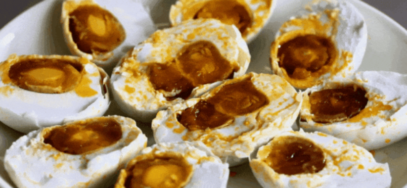 鹽和黃土按一定比例混合 加水攪拌成泥 鮮蛋入泥“滾泥” 再入草木灰“滾灰” 裹好泥灰的鴨蛋 裝入缸內(nèi)封存腌制 等待時間醞釀美味 到端午前就可以 取出清洗后蒸煮食用了