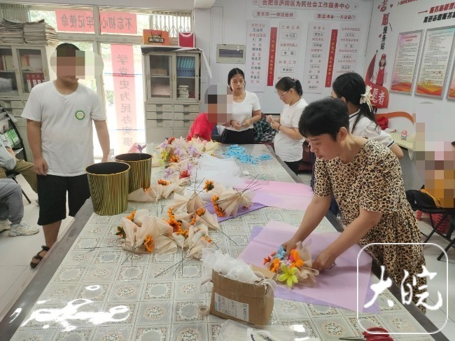 圖為幸福小院的孩子們?cè)诶蠋熞龑?dǎo)下,制作的手工花(幸福小院負(fù)責(zé)人李全志提供) 有了手工花制作 有了些收入 7月16日上午,在幸福小院的活動(dòng)室,大皖新聞?dòng)浾呖吹剑?8歲的晗晗和9歲的華仔正在特教老師和家長的陪伴下,制作手工花。華仔看在眼里記在心里,不需要提醒,知道每一步流程,會(huì)提前給老師遞工具,記下制作手工花的流程。去年三四月,華仔來到幸福小院,此前他沒有語言不會(huì)交流,但現(xiàn)在可以問一些簡(jiǎn)單的問題,偶爾對(duì)話幾句。“他剛來時(shí)一直性格急躁,經(jīng)過一年多的康復(fù)干預(yù),現(xiàn)在效果很明顯,像換了一個(gè)人似的?!毙炱G老師告訴大皖新聞?dòng)浾摺?/p>
